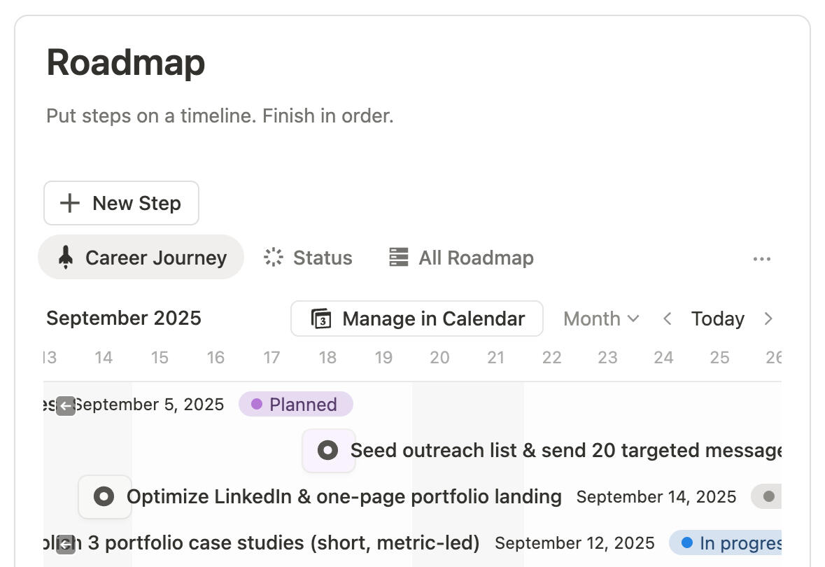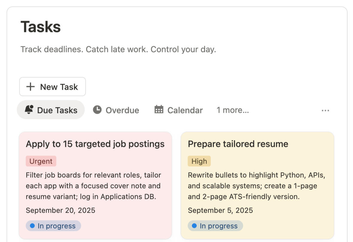 Create and prioritize to‑dos for applications, networking and learning. Set deadlines and automatic reminders in Notion so nothing slips through the cracks.