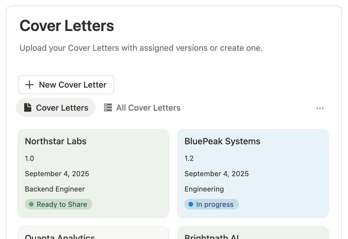 Store multiple resume versions, track which one you sent to each company and log recruiter feedback. Optimize your resume strategy with built‑in rating tracking.
